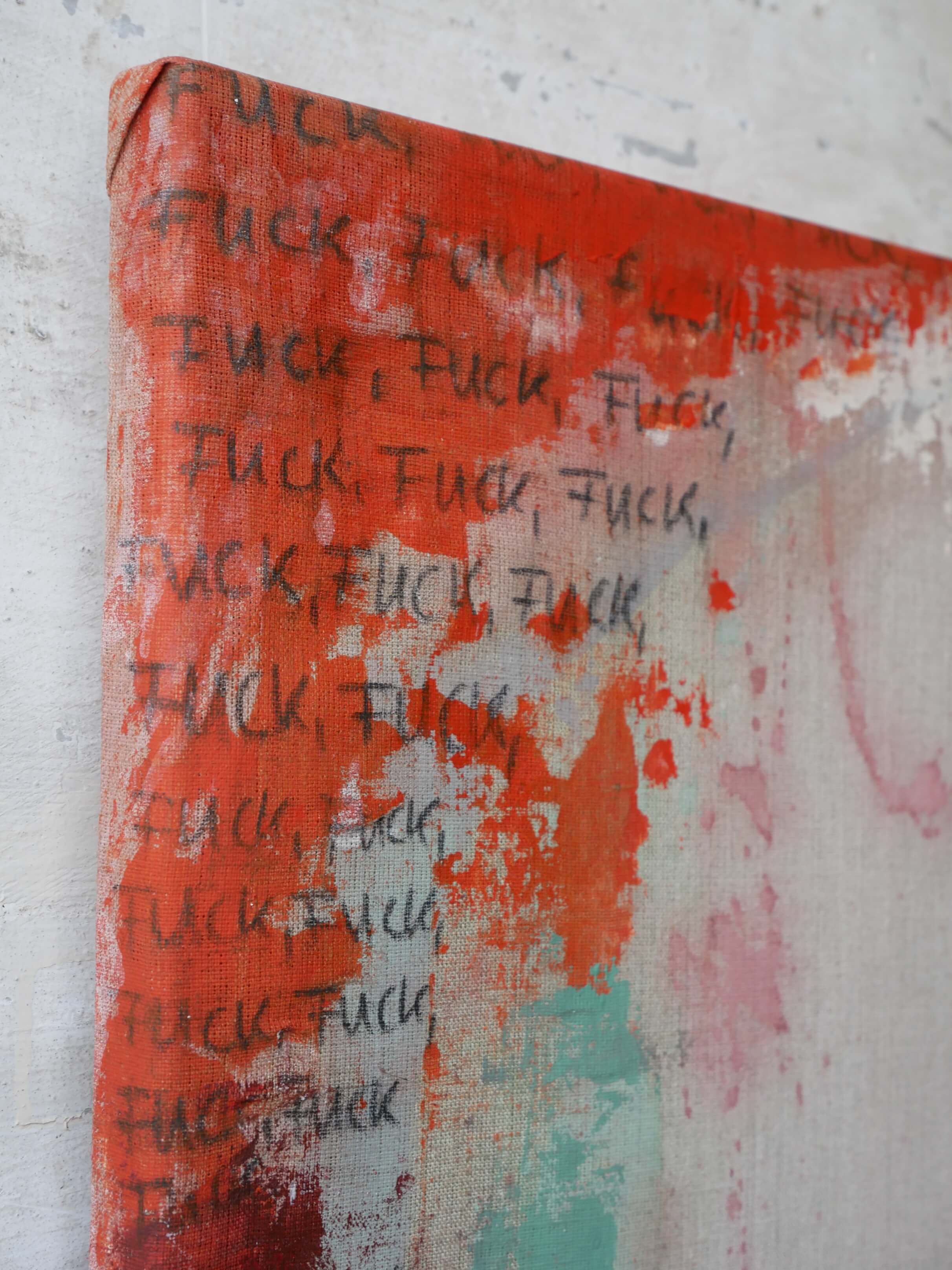 In variierender Intensität, teils übermalt und unleserlich, wiederholt sich das Wort „FUCK“ stellenweise immer und immer wieder. Es steht für Emotionen, die mal stärker, mal kaum vorhanden sind – Gefühle, die zwar ein Teil von uns sind, aber nicht das große Ganze ausmachen. Es steht für Selbstzweifel, Niederlagen, Frustration und Wut. Es steht für die Momente, in denen wir Angst haben zu versagen, uns selbst zu viel Druck machen, unsere Grenzen nicht klar kommunizieren oder das Gedankenkarussell sich zu schnell dreht.